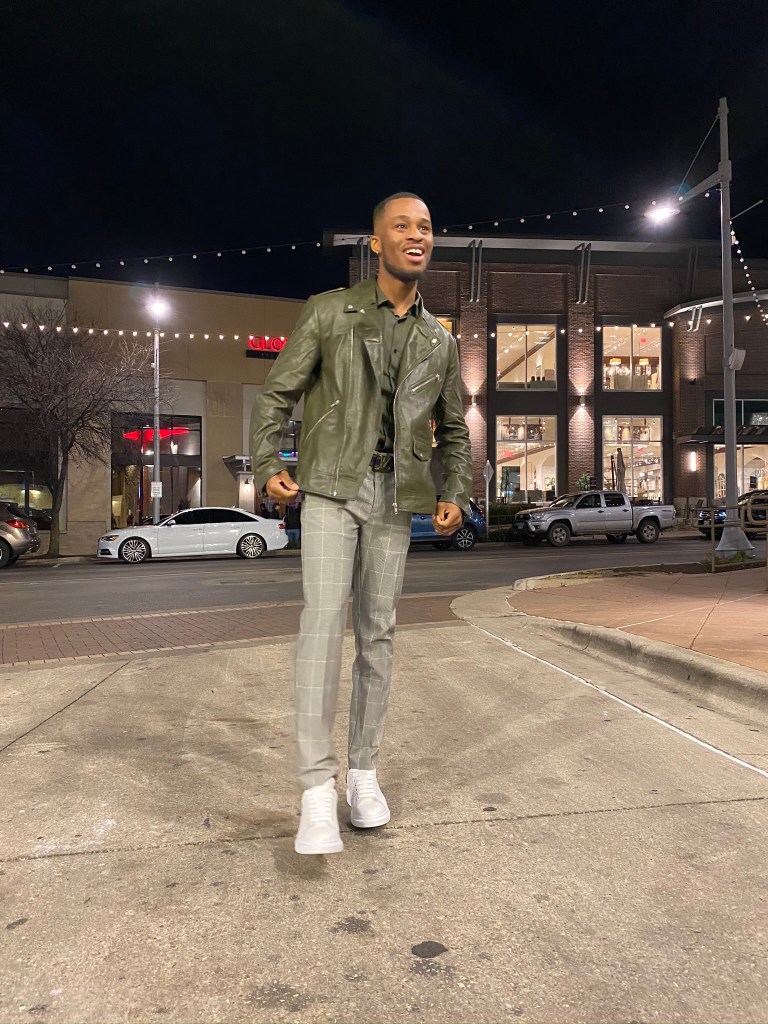 After a prolonged search, I was able to find this sleek leather biker jacket and poplin button down in a dim khaki/ olive color. Here, we begin to rework the color scheme down from the what is the focal point of the outfit.